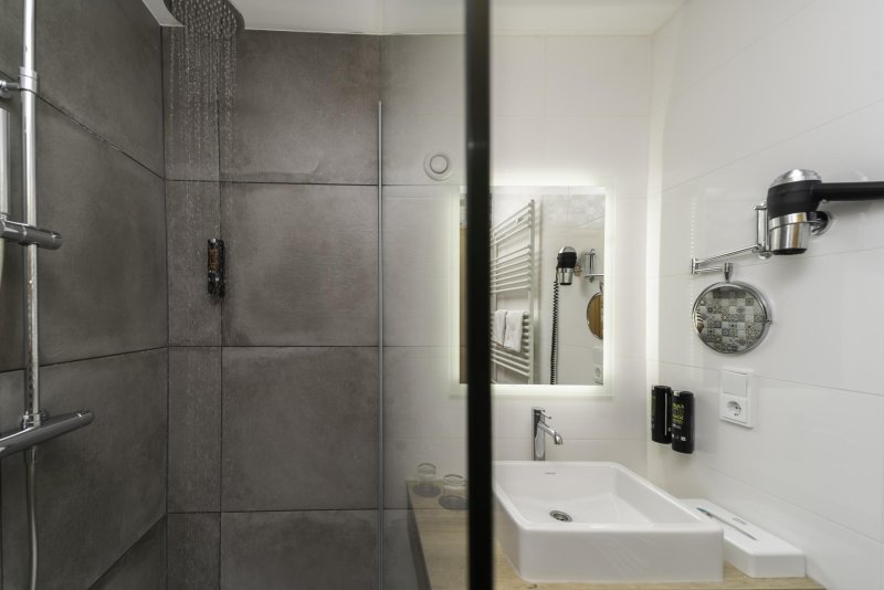 - Großzügiges Badezimmer mit Dusche, Schminkspiegel und Föhn